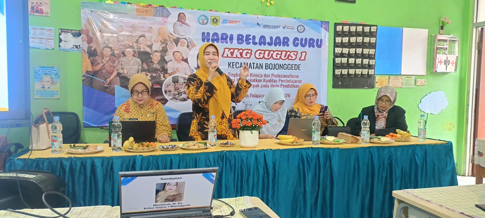 Sambutan disampaikan oleh Ketua KKG Gugus 1 Bojonggede, Ibu Muslimah, M.Pd. Dalam sambutannya, beliau menegaskan pentingnya kolaborasi dan sinergi antar sekolah sebagai kunci dalam menghadapi tantangan pendidikan yang terus berkembang.